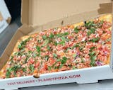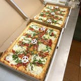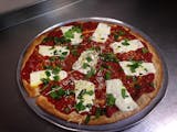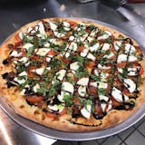 Traditional crust topped with plum tomato, fresh mozzarella, basil, balsamic glaze, EVOO.