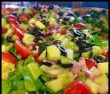 Cheeseless pizza with lettuce, tomato, cucumber, red onion and olive.
