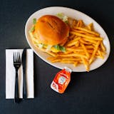 Patty with lettuce, tomato, ketchup, mayo.